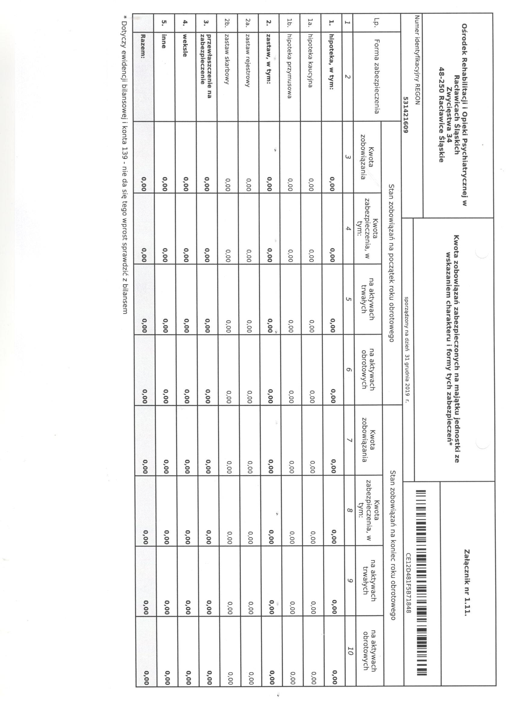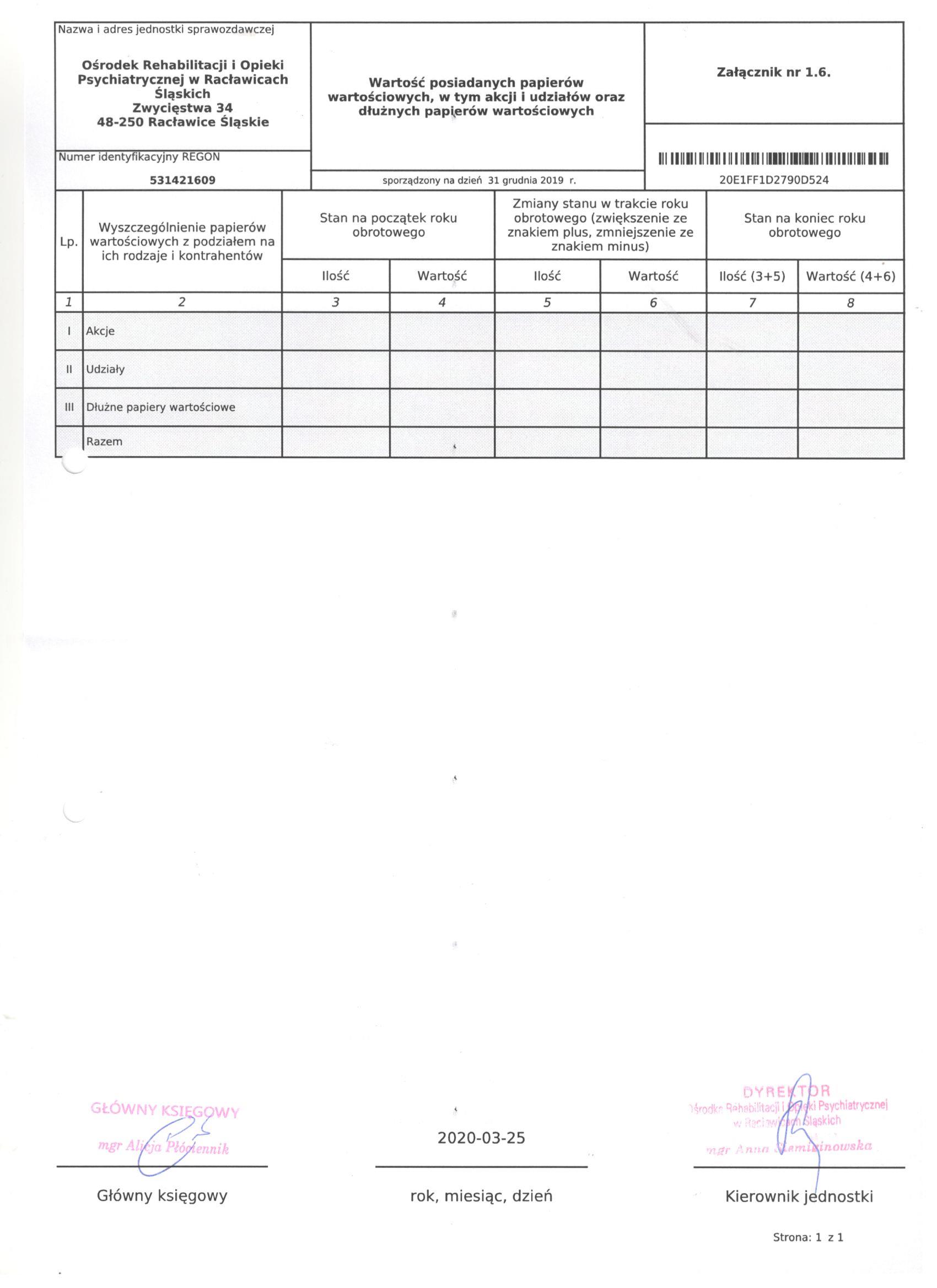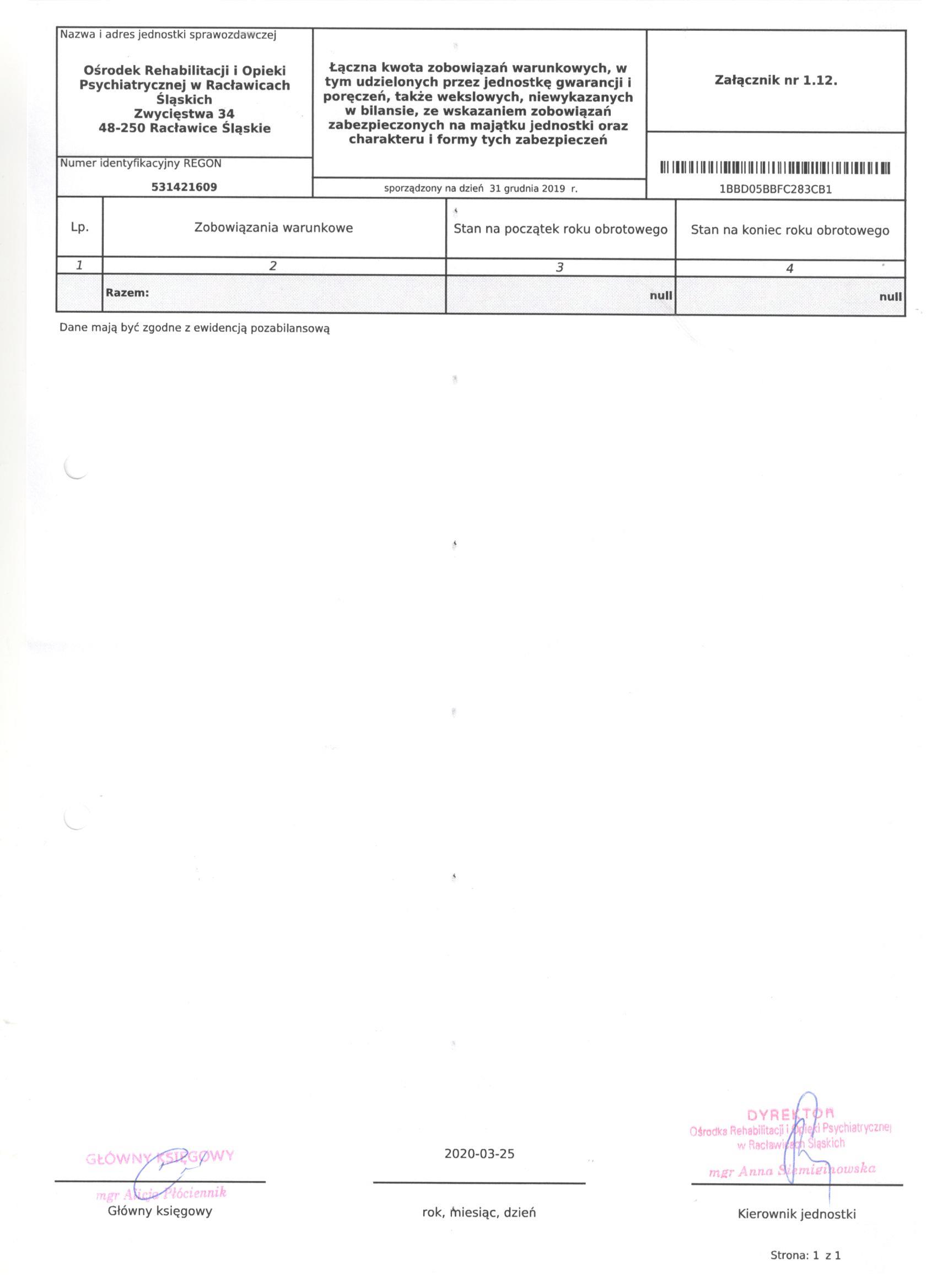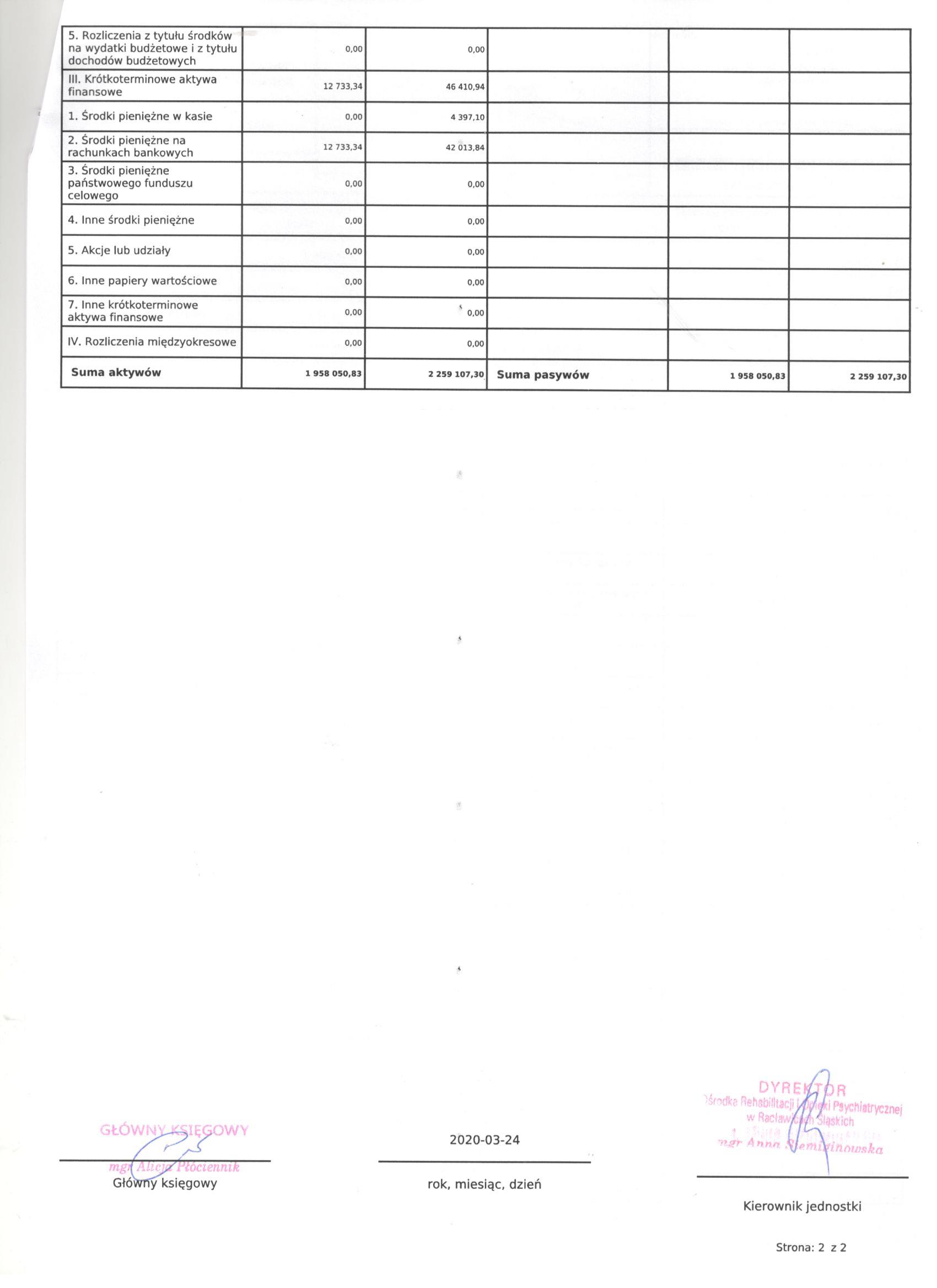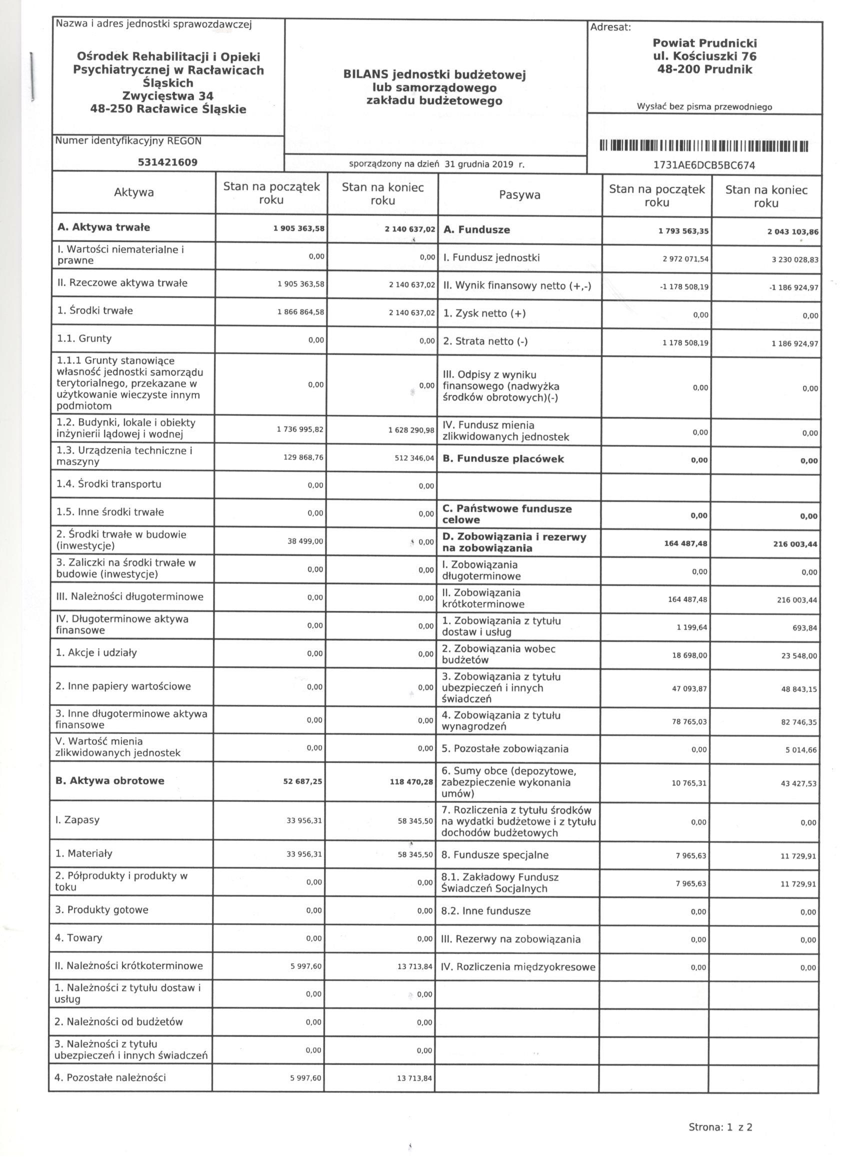 Bilans Jednostki Budżetowej sporządzony na dzień 31 grudnia 2019