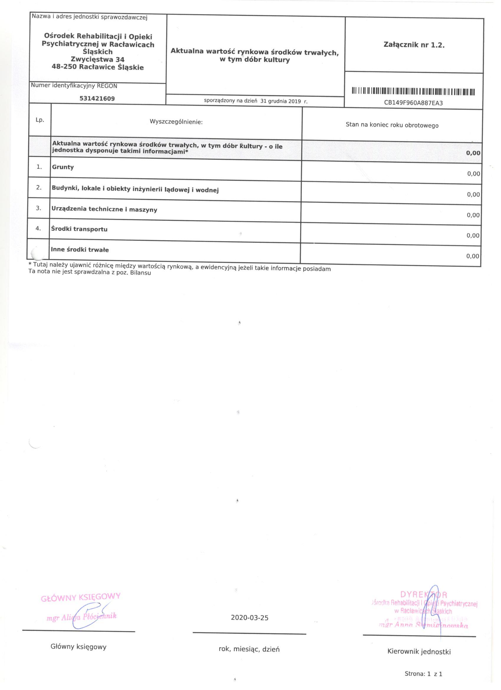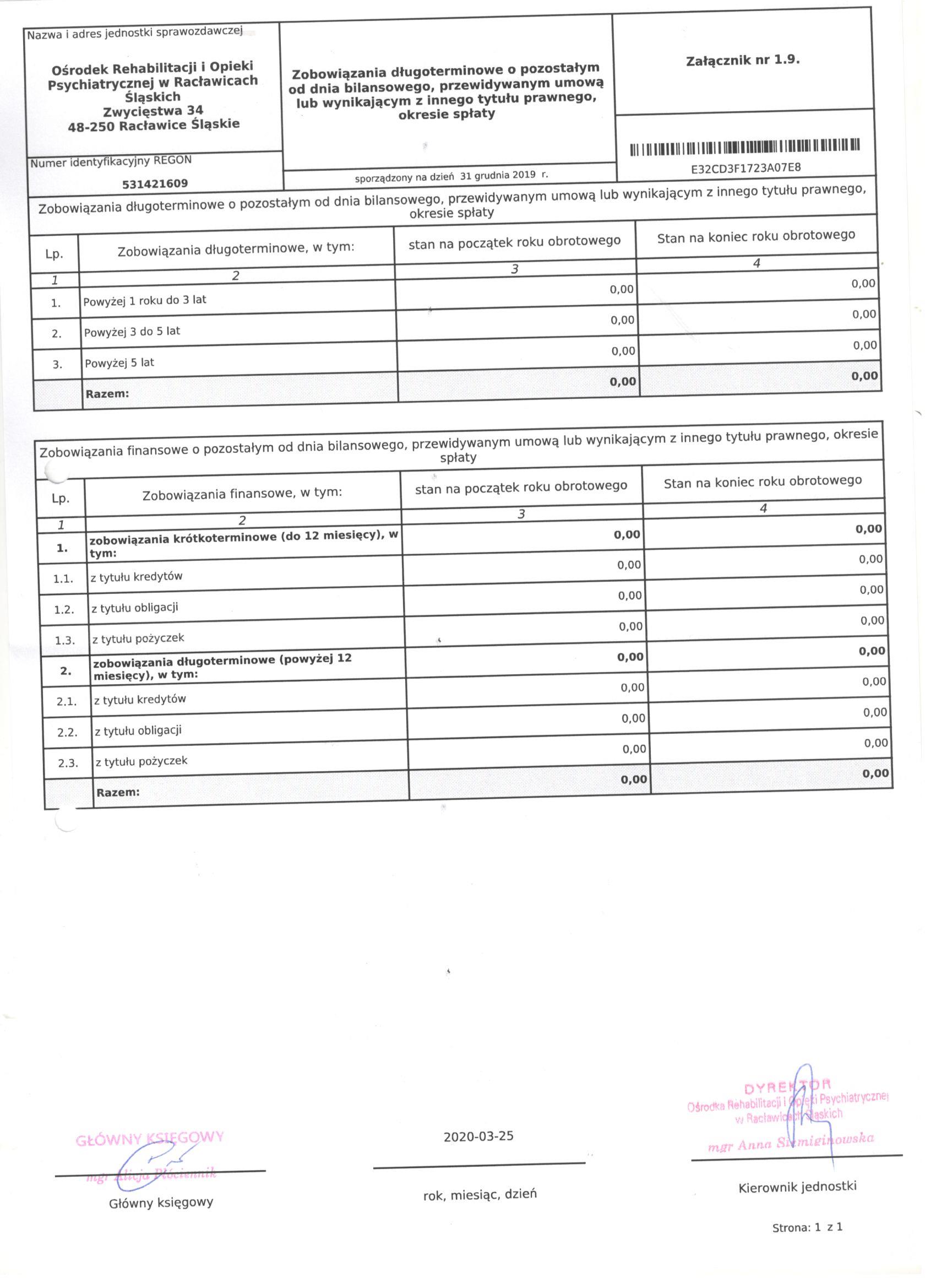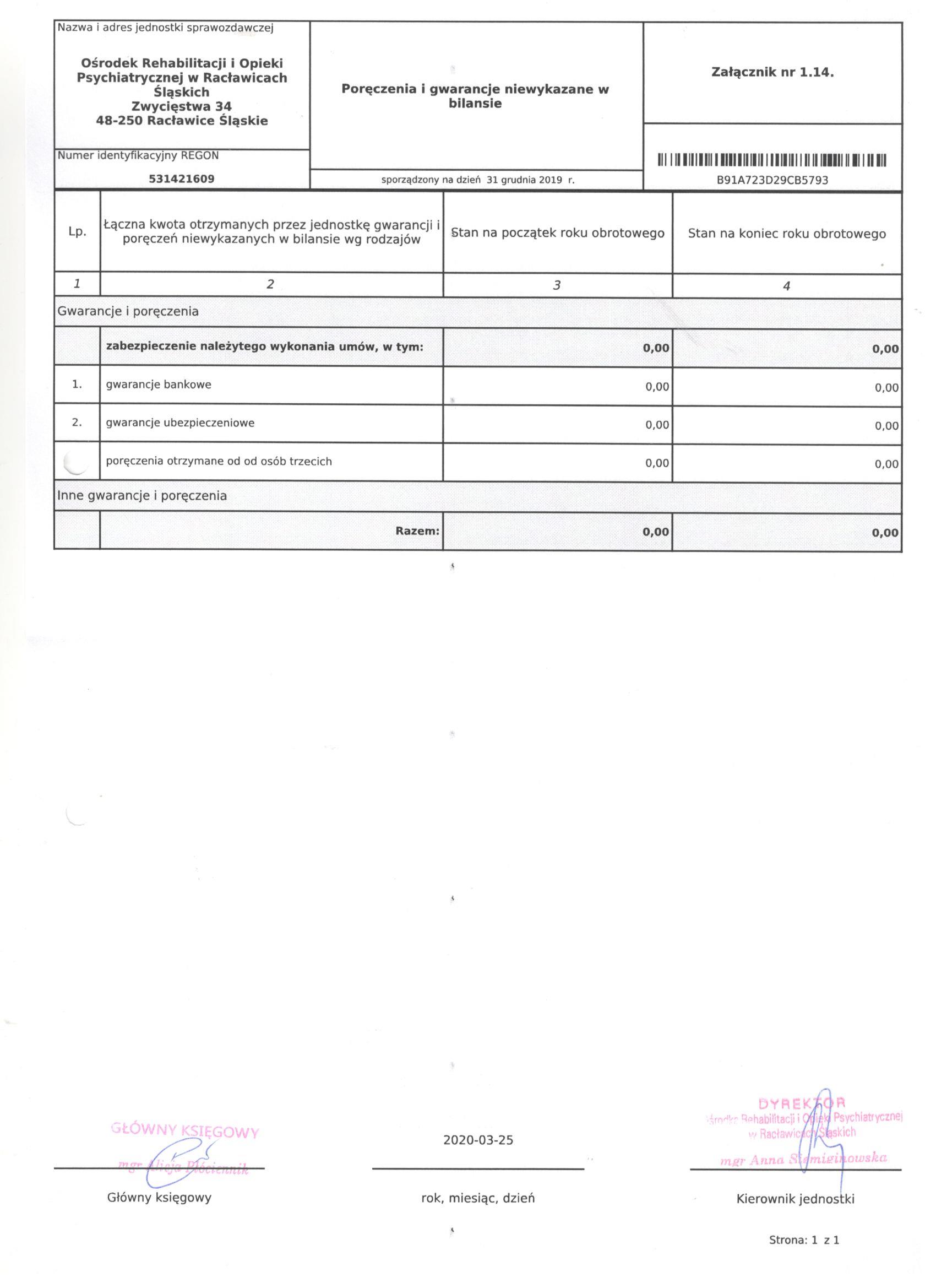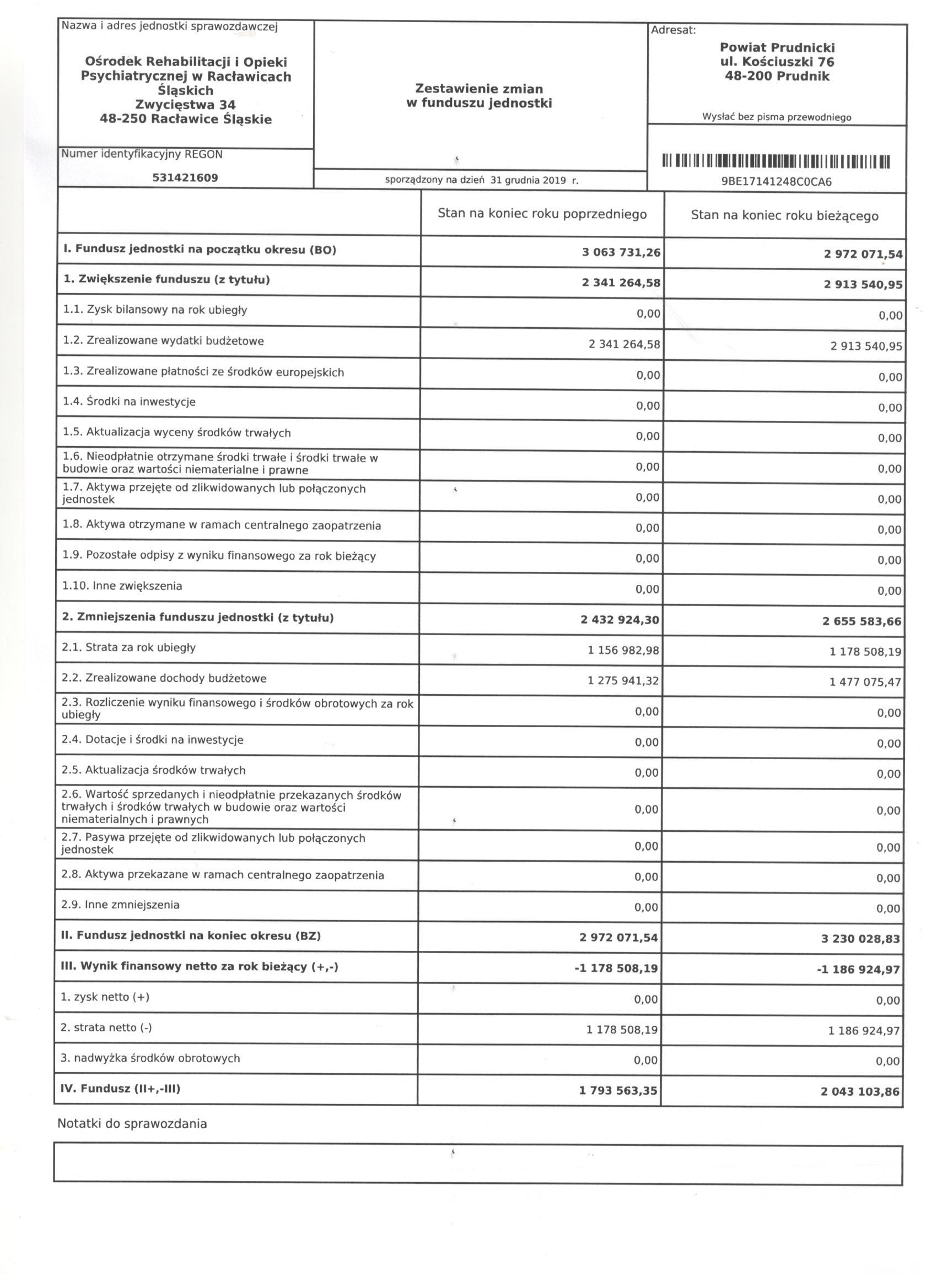 Bilans Jednostki Budżetowej sporządzony na dzień 31 grudnia 2019