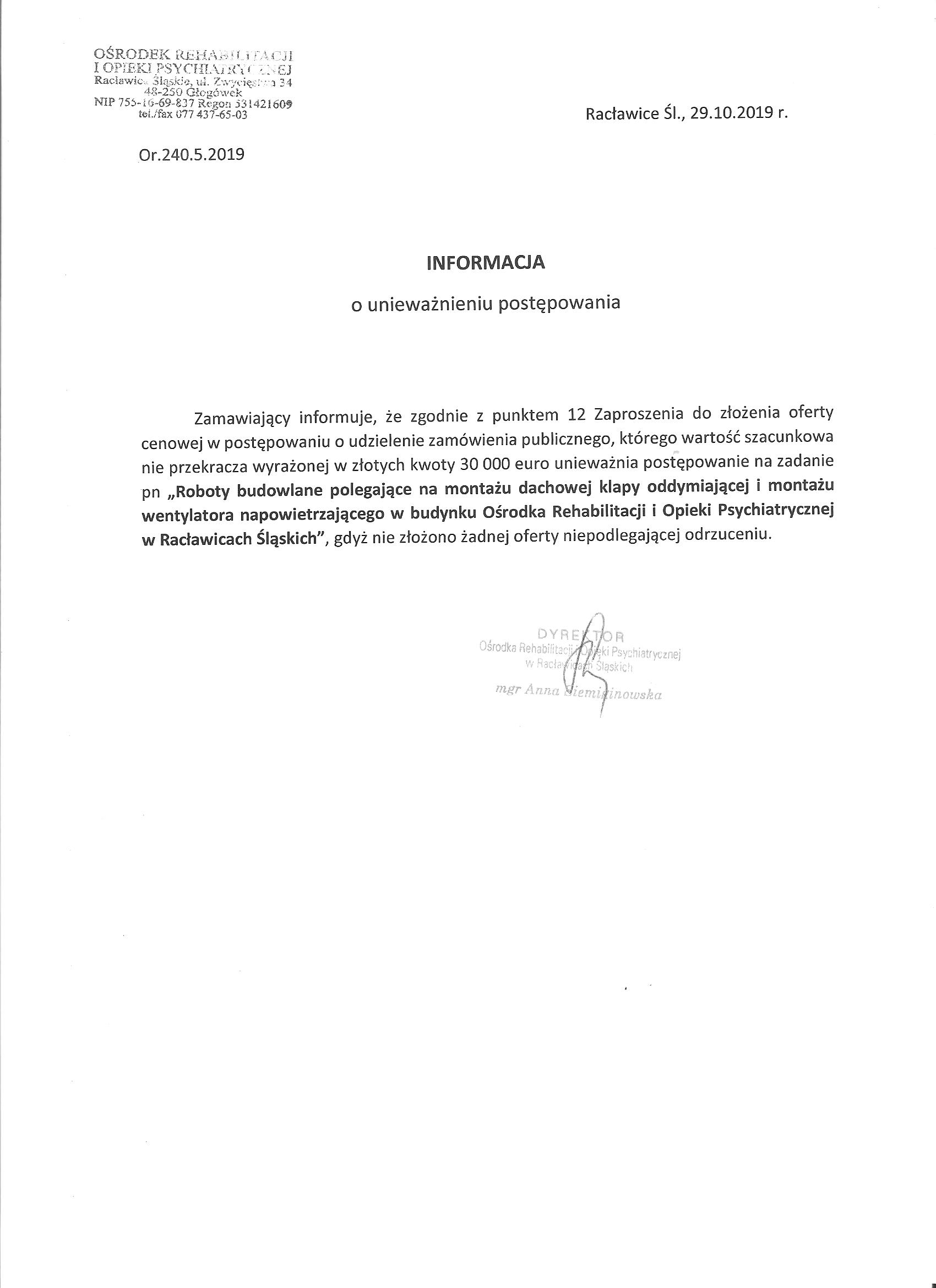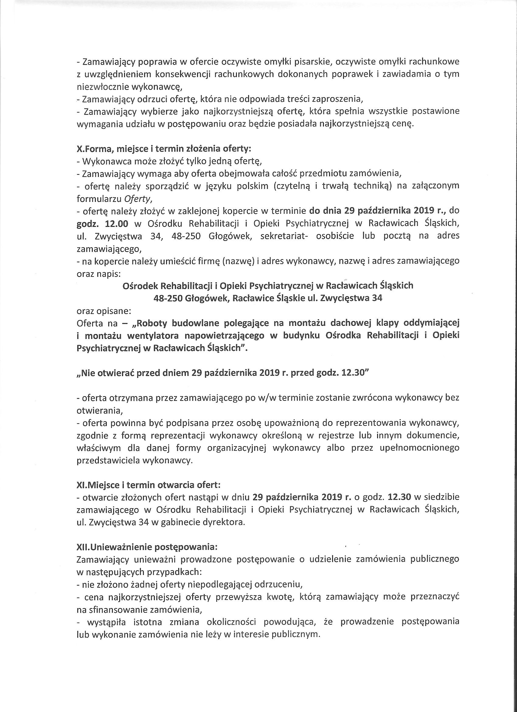 Roboty budowlane polegające na montażu dachowej klapy oddymiającej i montażu wentylatora napowietrzającego w budynku Ośrodka Rehabilitacji i Opieki Psychiatrycznej w Racławicach Śląskich.
